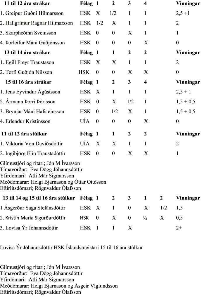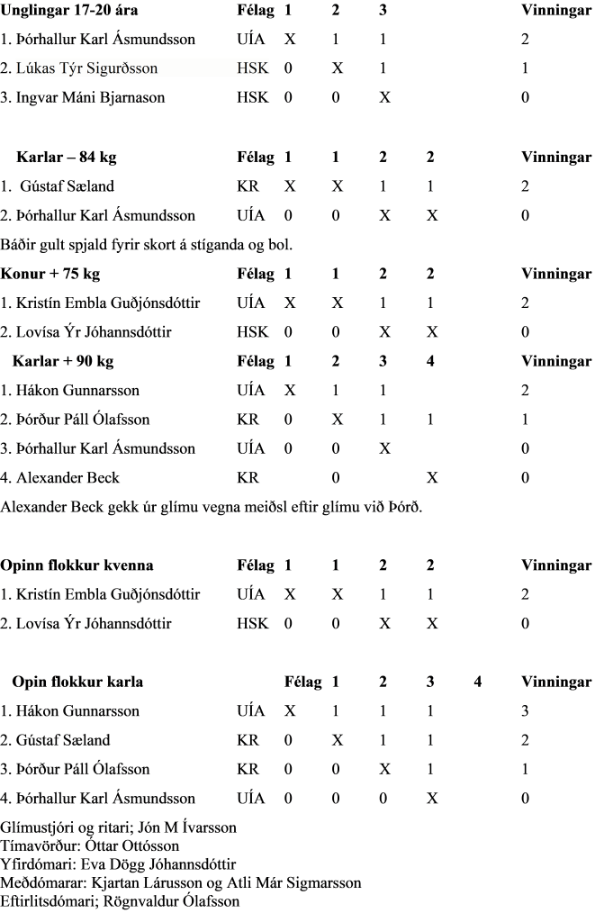 Úrslit mótsins voru eftirfarandi:
